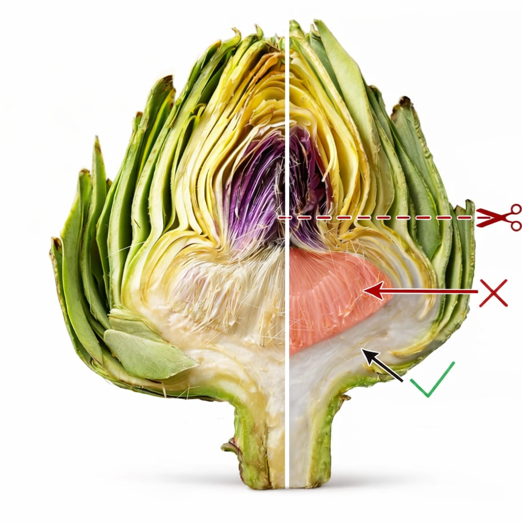Перед очищенням підготуйте миску з водою, у якій бутон артишоку повністю поміститься. Додайте сік одного свіжовичавленого лимона (з розрахунку на 0,5 л води). Ніжні листки артишоку та зрізи швидко окислюються, темніють і стають непридатними. Щоб уповільнити цей процес, артишок одразу занурюють у лимонну воду.