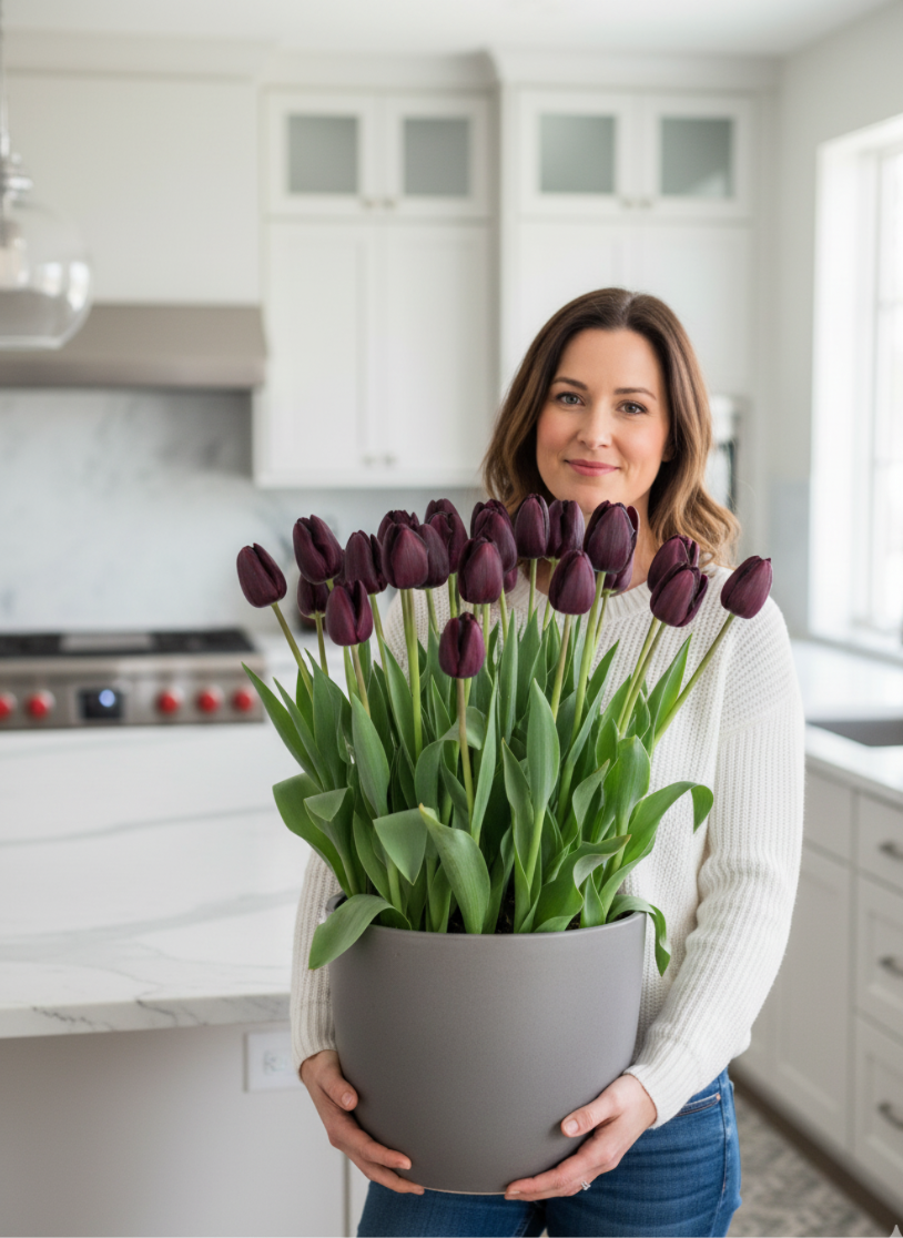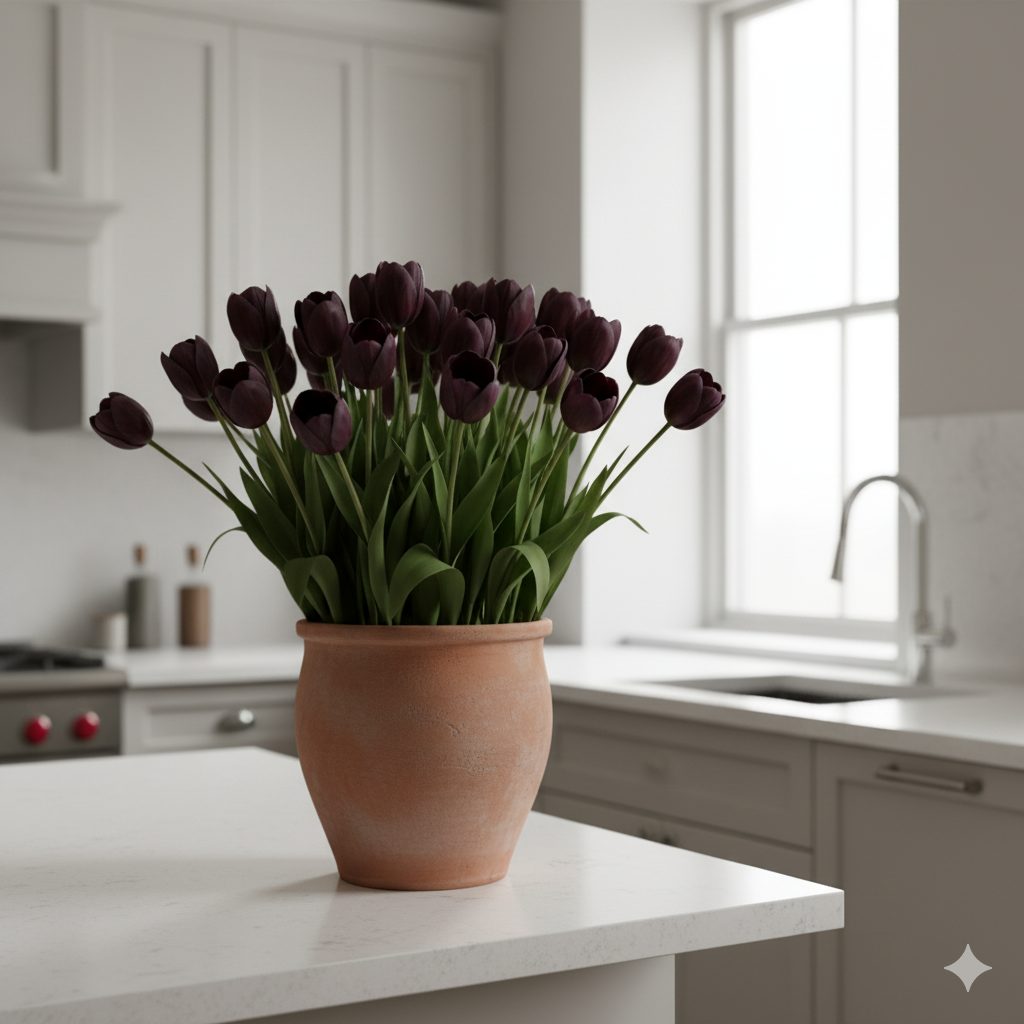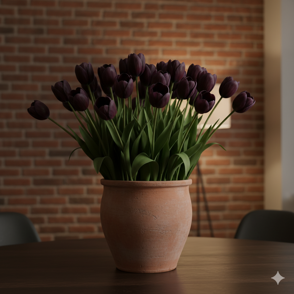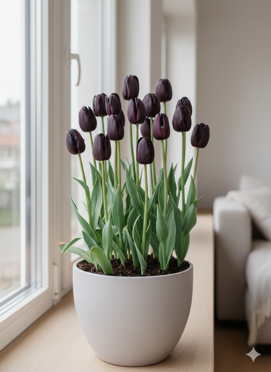Ці тюльпани можуть цвісти кількома хвилями, наповнюючи інтер’єр глибиною кольору та шляхетною естетикою.