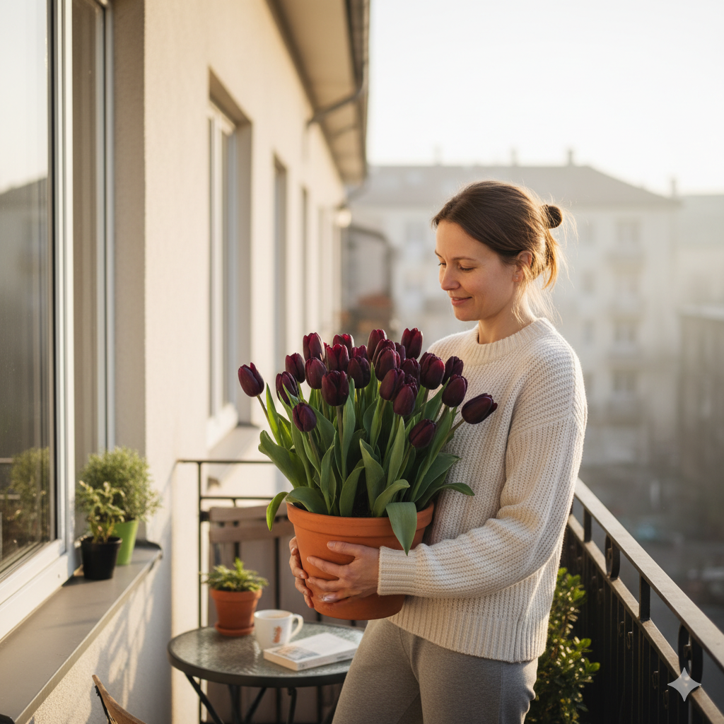 Тюльпани Queen of Night чудово підходять для вирощування в горщику, адже цибулини швидко вкорінюються та активно розвиваються в домашніх умовах.